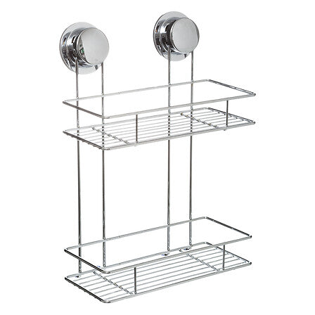 Structure en métal chromé avec double plateau de rangement. Fixation murale par ventouses puissantes, sans perçage. Idéal ...