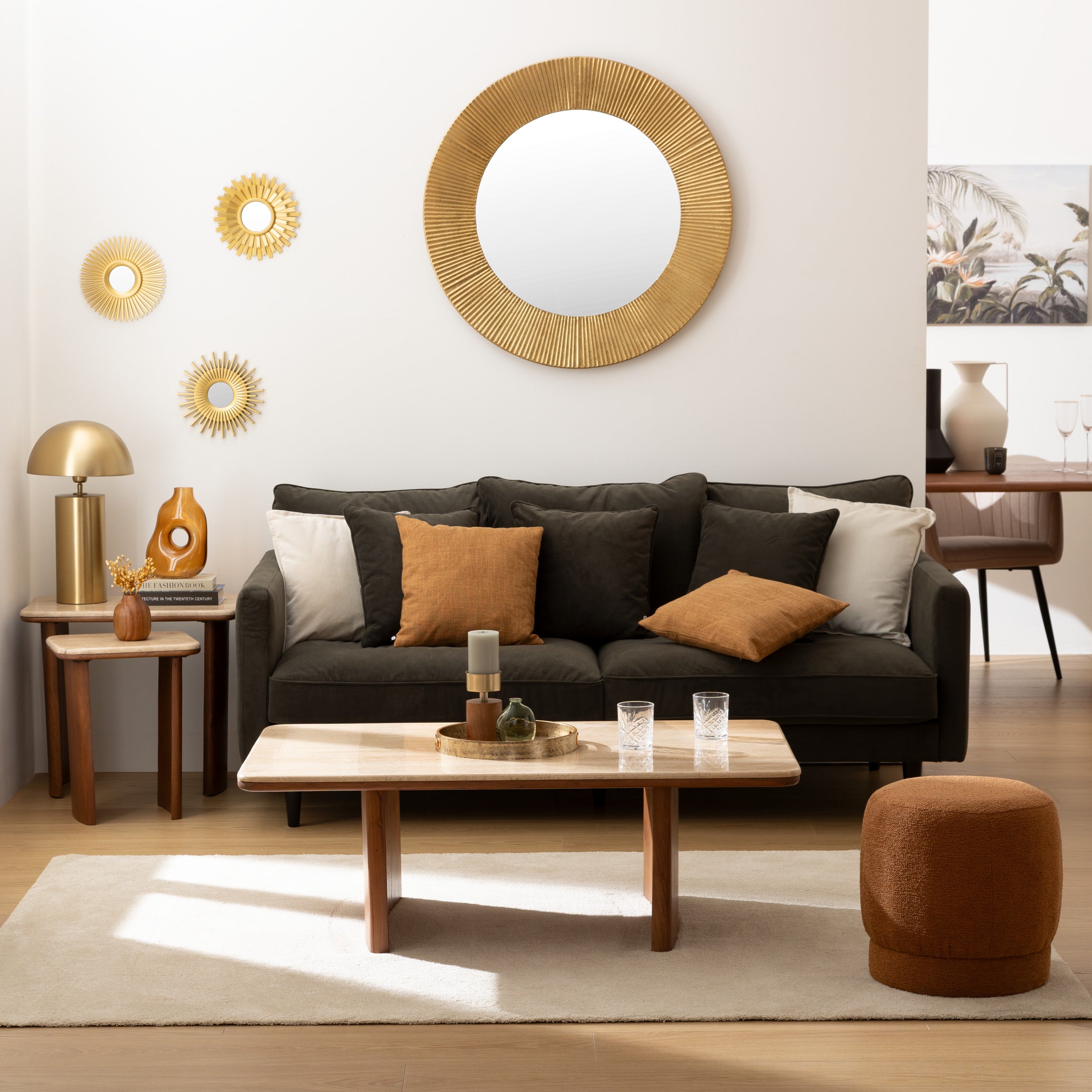 Le thème brut associe la chaleur du noyer au charme naturel du travertin. Ces matériaux authentiques créent un intérieur élégant, chaleureux et convivial, où la simplicité et la sophistication se rencontrent.