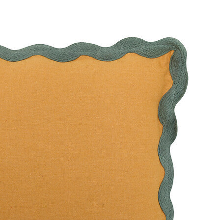 Coussin carré jaune ocre avec bordure ondulée verte – Style rétro et coloré